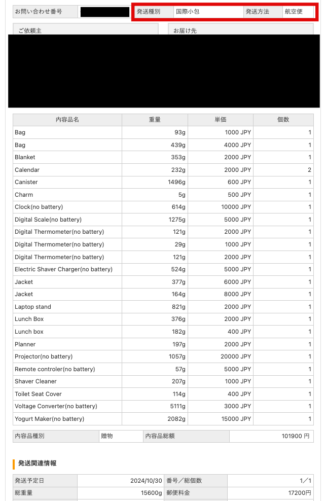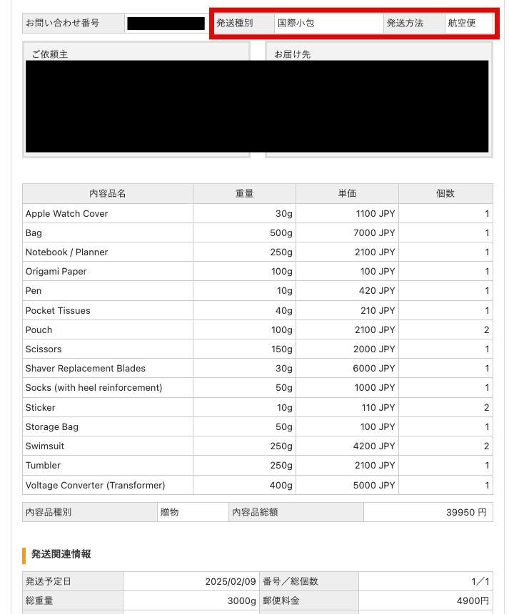 - 内容物の価格合計が大きいと関税がかかりやすい