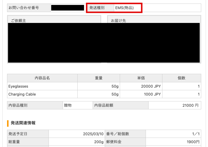 → 高額な荷物(2万円超)は、EMSであっても時間がかかる可能性あり。
