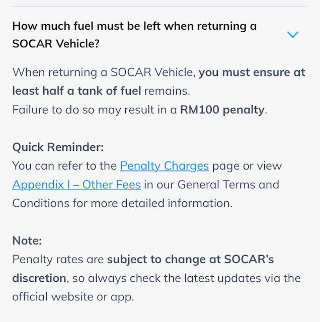 「ガソリン残量が50%未満で返却された場合、RM100のペナルティが課されます」