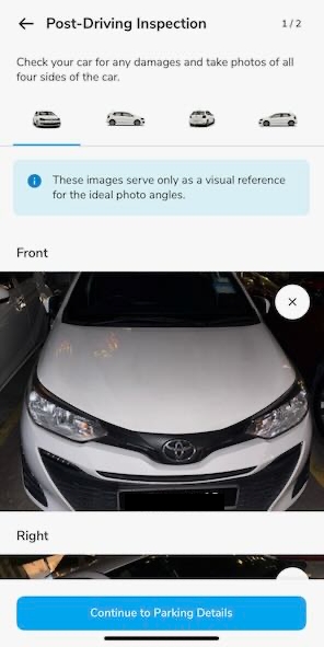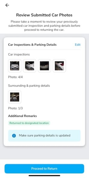 駐車を終えたら、アプリに表示される手順にしたがって返却を進めていきます。