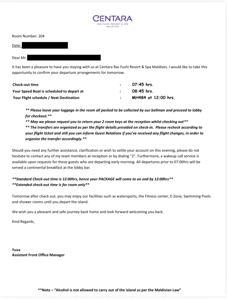 モルディブ旅行5日目の朝食、チェックアウトと精算の流れ、 マレ空港での様子、そして旅行全体でかかった金額を、